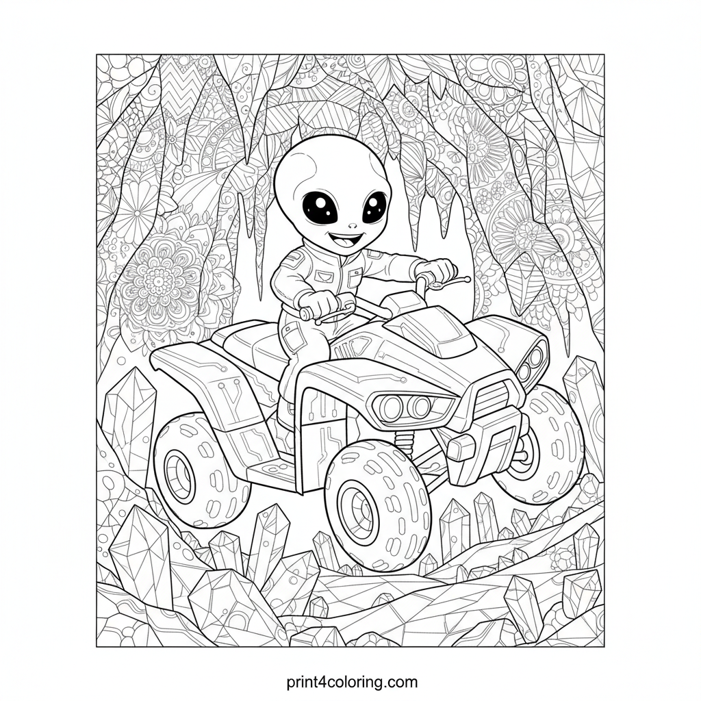 Embark on a thrilling journey into a dazzling crystal cave! A brave, friendly alien pilots a futuristic quad bike through a labyrinth of intricate geometric crystals. This action-packed scene is bursting with sparkling formations and abstract shadows, ready for you to bring to life with vibrant colors and imagination.