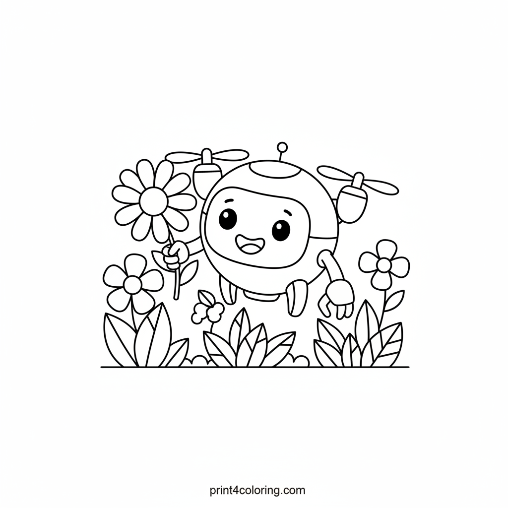 Imagine a super sweet drone, not just delivering packages, but delivering joy! This happy little drone, with its big, friendly smile, is carefully carrying a beautiful daisy through a bright, sunny garden. What colors will you choose for its cheerful journey?