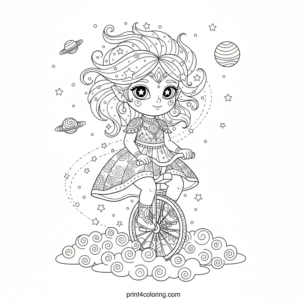 Embark on a magical journey with our whimsical Dream Weaver, gracefully pedaling a starlight unicycle across a sky full of puffy, patterned clouds. Watch as sparkling eyes guide the way, leaving a trail of glowing dust amidst distant planets and twinkling stars. A truly enchanting scene for imaginative colorists!