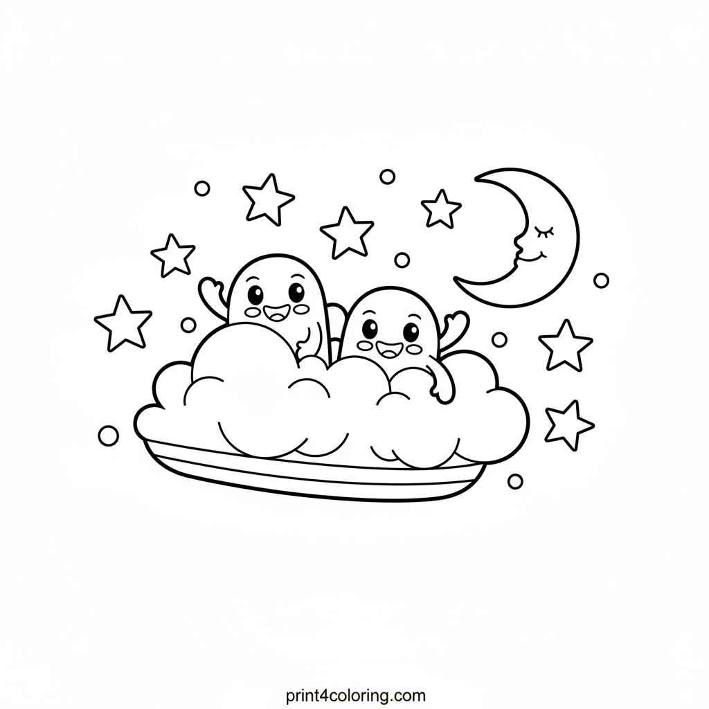Embark on a magical journey aboard a fluffy cloud boat! This whimsical scene features a gentle vessel sailing through a star-studded sky, adorned with shimmering crescent moons. Two friendly cloud creatures wave hello from the side, inviting you to add vibrant colors to their enchanting world high above.