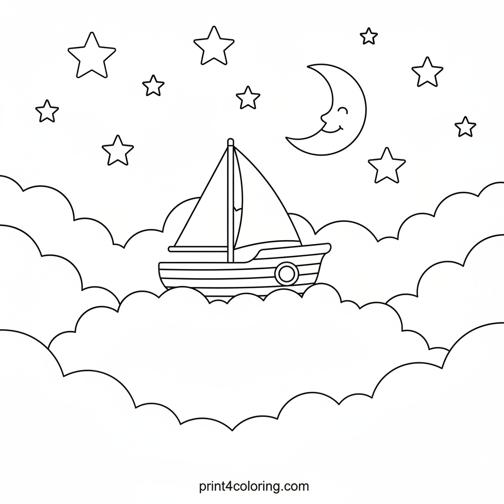 Imagine drifting through the night sky on a magical cloud yacht! This enchanting scene features a whimsical boat gently sailing on fluffy clouds, surrounded by a twinkling galaxy of stars and a smiling crescent moon. Grab your crayons and bring this dreamy adventure to life with vibrant colors. Perfect for little dreamers!