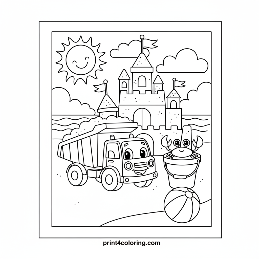 Join a cheerful dump truck on a sunny beach, busy building the most magnificent sandcastle! Watch as it carefully pours sand, while a friendly little crab waves hello from a nearby bucket. This fun scene is waiting for your vibrant colors. Get ready for a sandy adventure!
