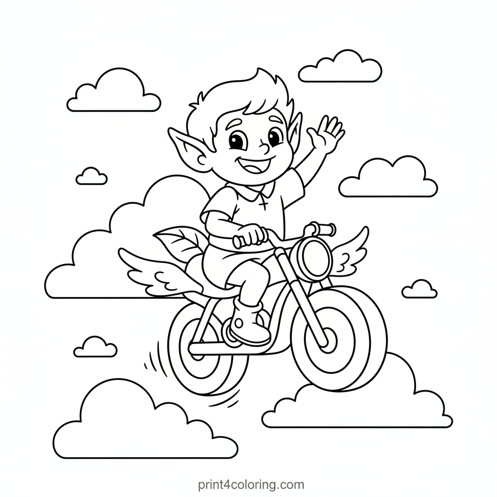 Imagine soaring through the sky with a friendly elf on a magical motorcycle! This whimsical scene features a tiny-winged bike gently 'hopping' between fluffy clouds in a vibrant blue sky, with our cheerful elf waving a warm hello. Get ready to add your favorite colors to this delightful aerial journey.