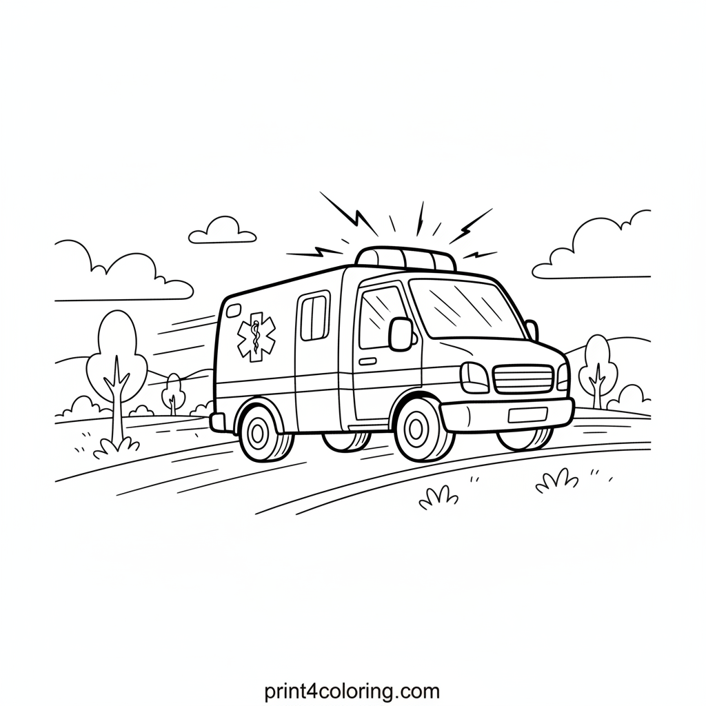 Join the brave ambulance on an important mission! This dynamic scene shows a modern ambulance speeding safely down an open road, lights flashing. Wispy lines show its helpful speed as it rushes to help someone in need. A perfect page for aspiring heroes to color with bright, bold colors!