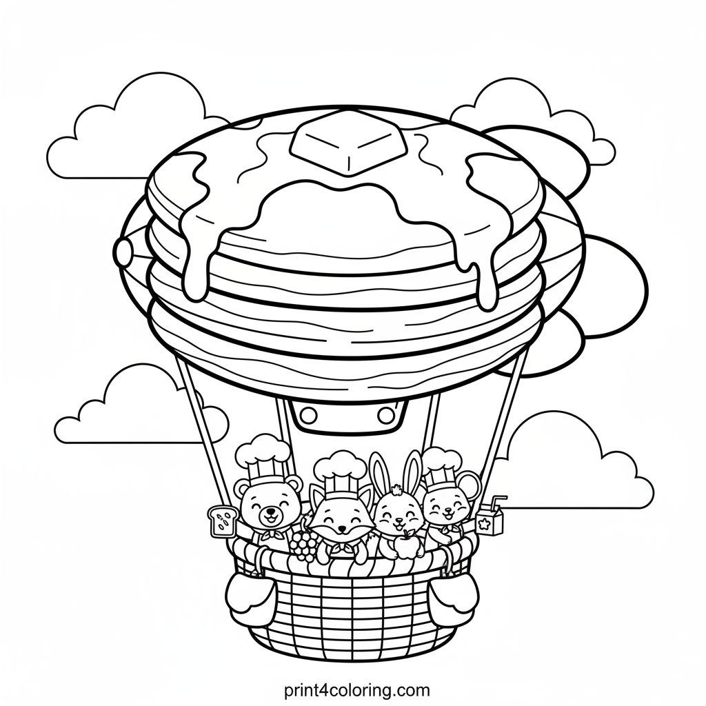 Soar into a delicious adventure with this whimsical scene! A giant blimp, shaped like fluffy pancakes with melting butter and dripping syrup, glides through the sky. A team of adorable chef animals in a basket below are busy delivering a scrumptious breakfast. A truly sweet journey awaits your colors!