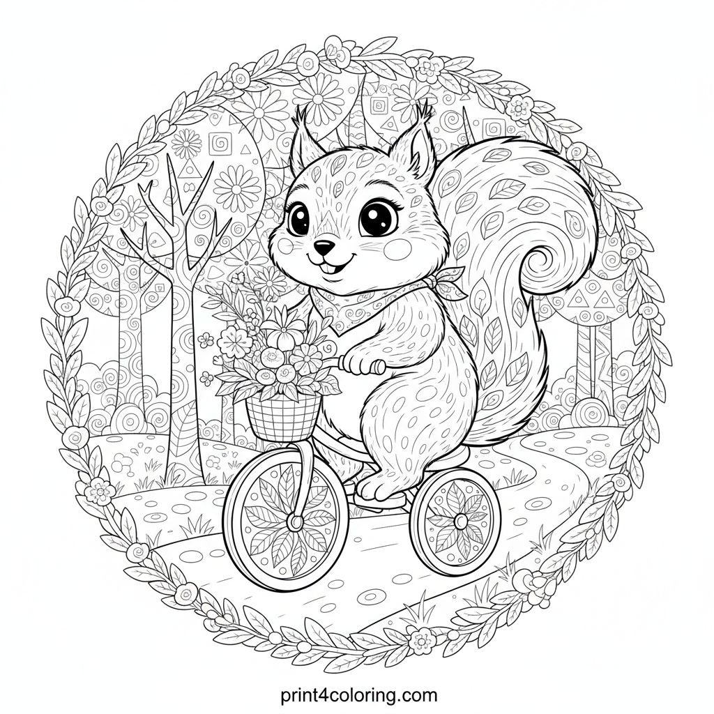 Join a cheerful, fluffy squirrel on its first tricycle ride through a sun-dappled forest path. Adorn the tricycle's oversized wheels with intricate leaf and vine zentangle patterns and bring the overflowing basket of wildflowers to life. Explore whimsical, geometric foliage, creating an enchanting woodland scene.