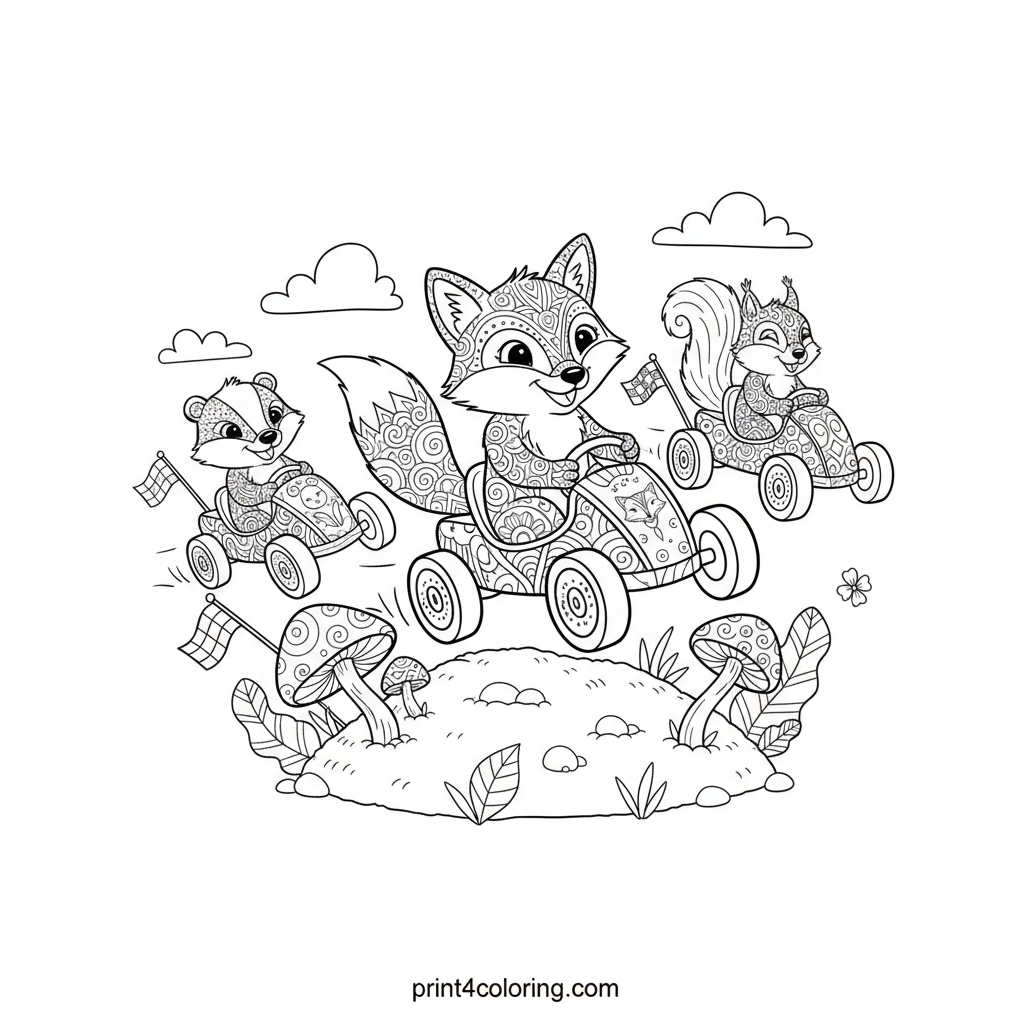 Join a cheerful fox, giggling badger, and determined squirrel at the whimsical starting line of the Forest Friends Go-Kart Grand Prix! Each animal is in their uniquely detailed go-kart, ready to race through the woodland. This intricate scene, with tiny flags and patterned wheels, offers a thrilling coloring adventure for young artists.