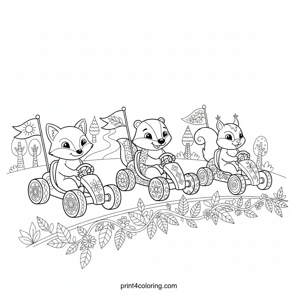 Join the most adorable race in the forest! A cheerful fox, a giggling badger, and a determined squirrel are lined up at a whimsical starting line of flowers and leaves. Each in their cute go-karts, complete with tiny flags and patterned wheels, they're ready for a friendly rally. Bring this exciting forest adventure to life!