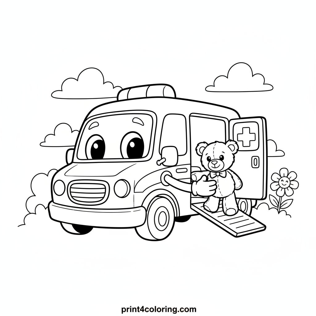 Join our kind-hearted ambulance friend as it gently helps a tiny, fluffy teddy bear into its cozy back. With big, friendly eyes and a warm, soft glow, this hero on wheels is ready to comfort and care for its little passenger. A heartwarming scene perfect for young artists to bring to life with colors!