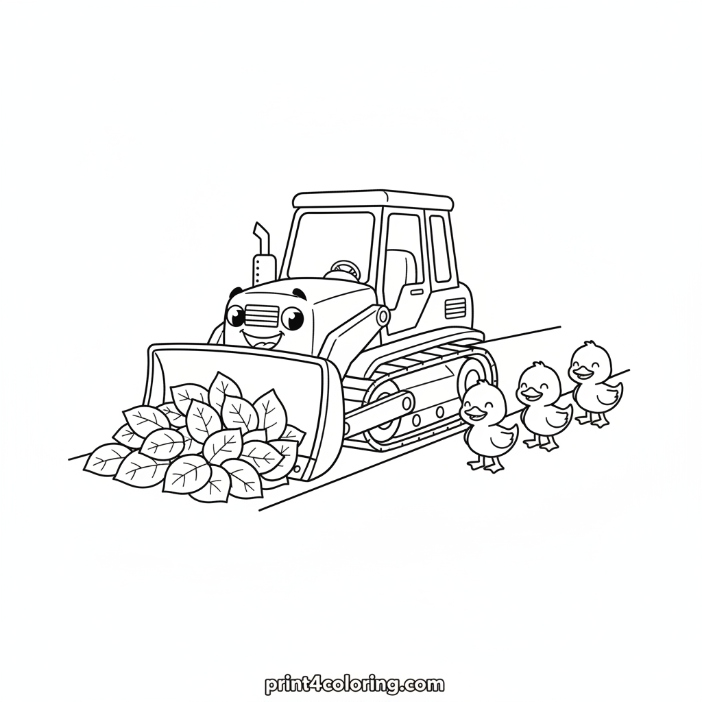Meet a kind-hearted bulldozer with a friendly grin, clearing a vibrant path of colorful autumn leaves. Watch as a line of happy little ducklings waddle joyfully along their newly cleared route, heading straight for their sparkling pond. A delightful scene for young artists to color!