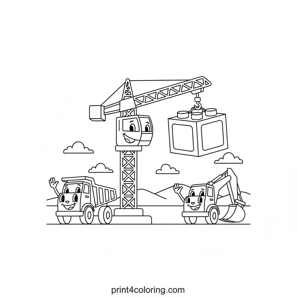 Join our cheerful construction crane as it proudly lifts a massive, colorful toy block high into the bright sky! Look closely, and you'll see other friendly construction vehicles waving hello in the background, making this a bustling and happy construction site. What colors will you use to bring this playful scene to life?
