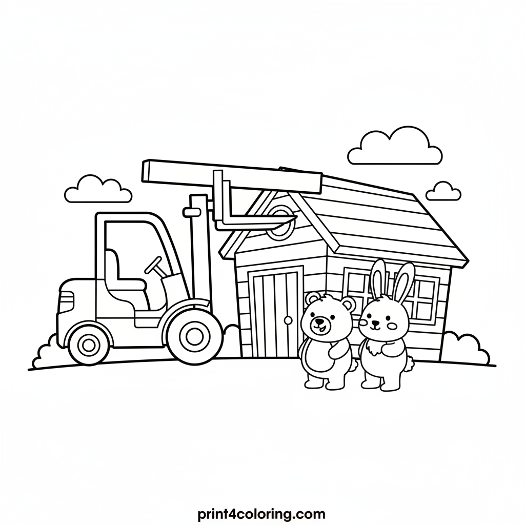 Join a helpful forklift as it assists a cheerful bear and a busy bunny in building their dream playhouse! Watch the forklift carefully lift a colorful roof beam into place. This fun construction scene is perfect for little builders to color with vibrant shades and imagine their own building adventures.