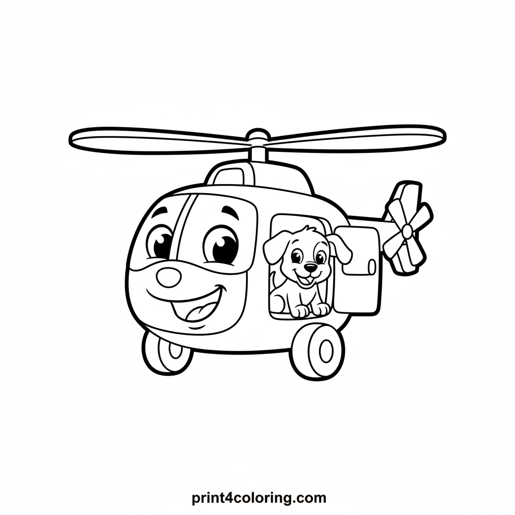 A cheerful cartoon rescue helicopter with a wide smile and curious eyes is on a special mission! A cute, happy puppy with a wagging tail peeks out from its open door, ready for a fun adventure. Get ready to add vibrant colors to this heartwarming scene!