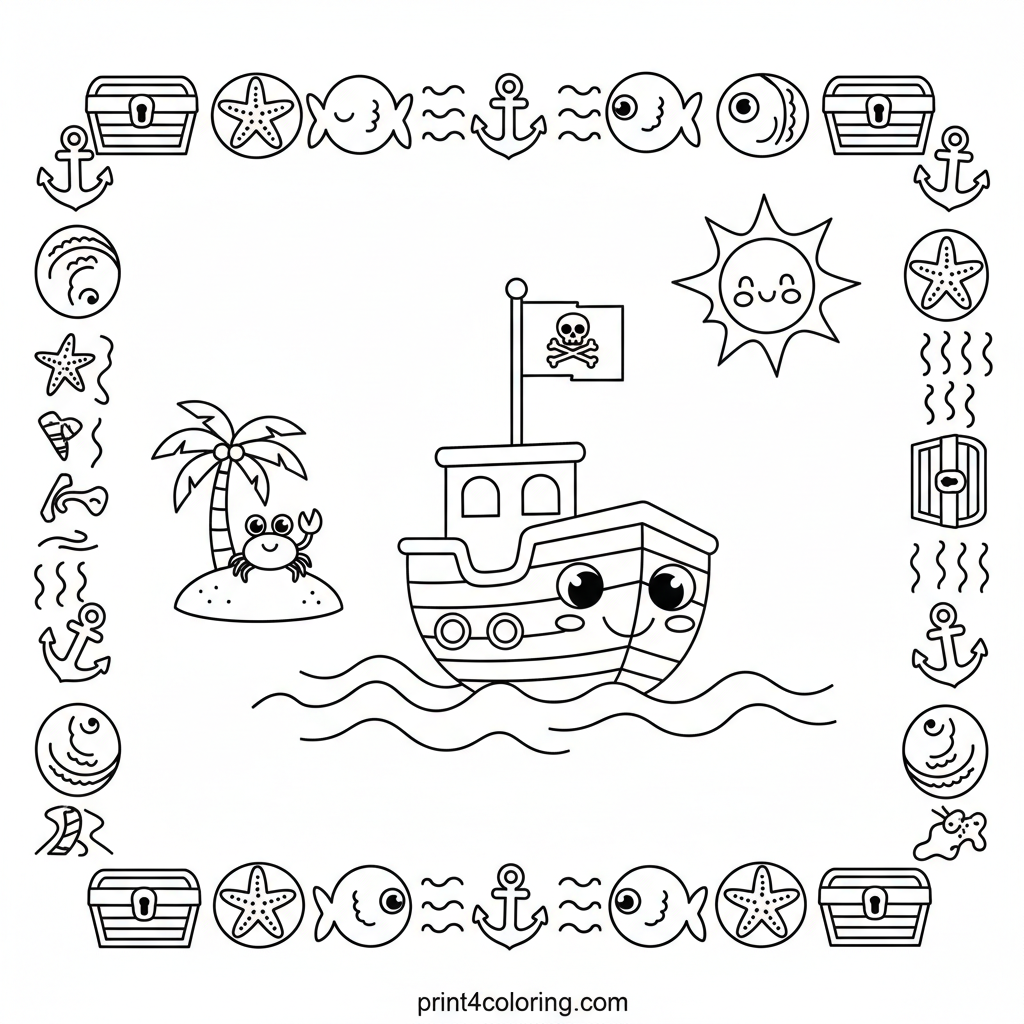 Set sail for a delightful high-seas journey with this super friendly pirate ship! With big, happy eyes on its bow, this cheerful vessel glides across gentle blue waves under a bright, sunny sky. A tiny, sandy island is nearby, where a cute little crab waves hello, inviting you to color a wonderful adventure!