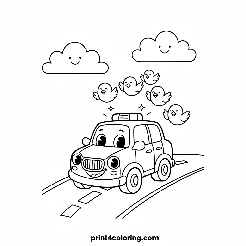 Join a happy police car as its siren lights gently flash, playfully chasing a flock of friendly, smiling birds! This simple scene features a winding road and a cheerful atmosphere, perfect for little artists. Bring this joyful adventure to life with your favorite colors!