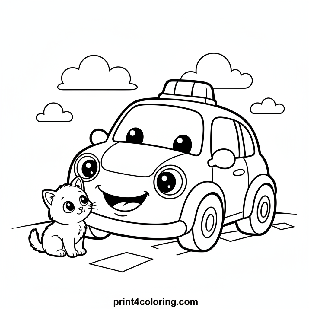 Imagine a chubby, smiling police car with big, friendly headlights and a happy siren! This kind helper is on a special mission, gently guiding a tiny, lost kitten back to its cozy home. It's a heartwarming scene of community and compassion, perfect for little artists to bring to life with their favorite colors.