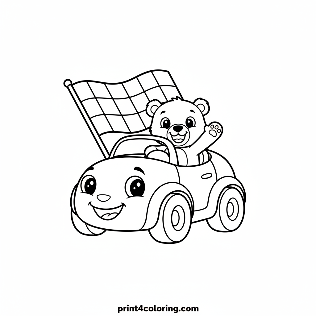 Get ready for an adorable race! This page features a super friendly, smiling race car with big cartoon eyes. A cute bear cub waves happily from the cockpit, ready to zoom. A simple checkered flag in the background completes this cheerful scene, perfect for little racers and animal lovers to color!