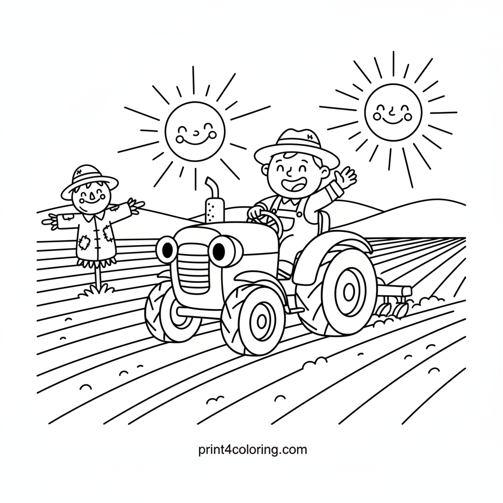 Join a friendly red tractor as it chugs along in a bright, sunny field, gently plowing rows to help crops grow! A kind farmer waves hello from the driver's seat, and a happy scarecrow watches over everything with a smile. Imagine the warm sunshine and fresh earth as you bring this busy farm scene to life!
