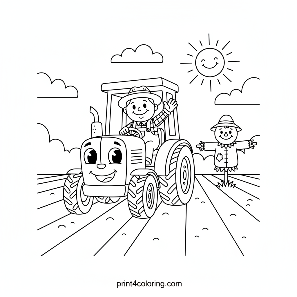 Join our friendly tractor as it works hard in a sunny field, gently plowing rows for new crops! A happy farmer waves from the driver's seat, while a cheerful scarecrow stands by, watching the farm fun. Get ready to add vibrant colors to this busy farm scene!