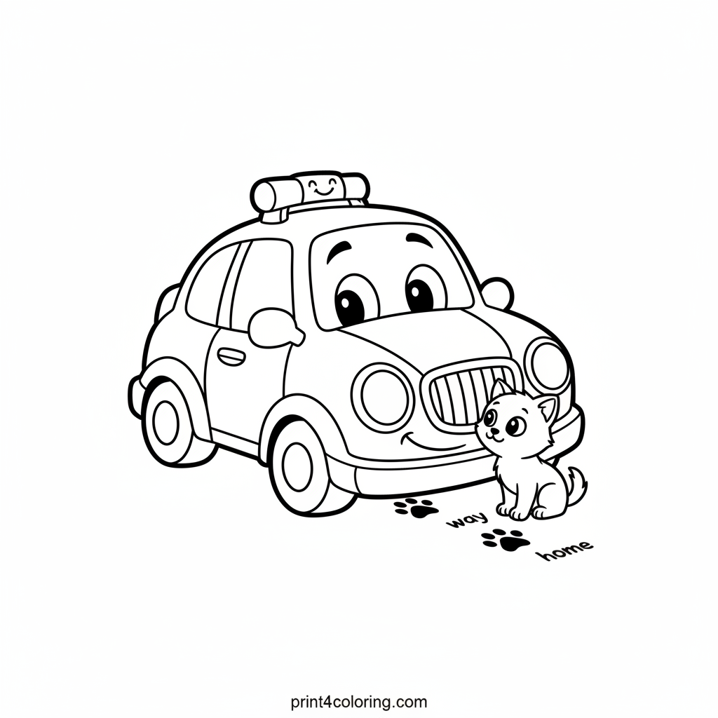 Join our cheerful, chubby police car with its big, friendly headlights and happy siren as it embarks on a heartwarming mission! This kind helper is gently guiding a tiny, lost kitten back to its cozy home. A sweet scene perfect for little artists who love vehicles and animals working together to keep everyone safe.