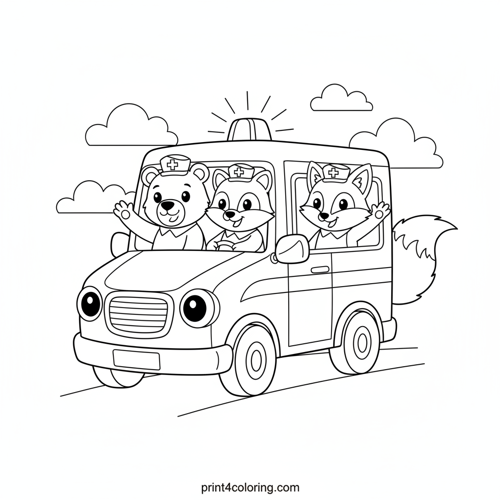 Join our brave bear and clever fox, wearing their little paramedic hats, as they race to help in their comically oversized ambulance! This friendly vehicle has its own cartoon eyes and a wagging tail, making every emergency a joyful adventure. Get ready to add vibrant colors to this heartwarming scene of animal heroes on duty!
