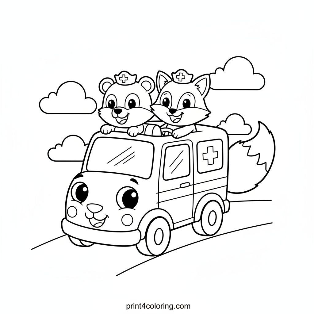 Join a cheerful bear and a helpful fox as they zoom into action in their super-duper ambulance! This special vehicle has friendly cartoon eyes and even a wagging tail, making every rescue mission an exciting adventure. Grab your crayons and bring this adorable animal paramedic team to life!