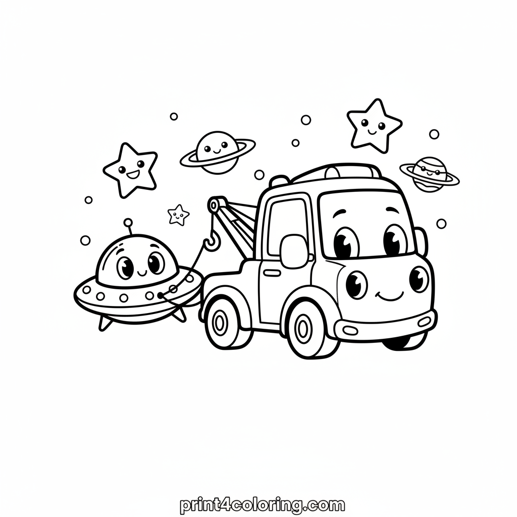Zoom into the cosmos with a super-friendly space tow truck on a special mission! Watch as it gently guides a small, bubbly alien spaceship through a field of twinkling stars and smiling planets. Get ready to add your favorite colors to this cosmic adventure and help our space hero save the day!
