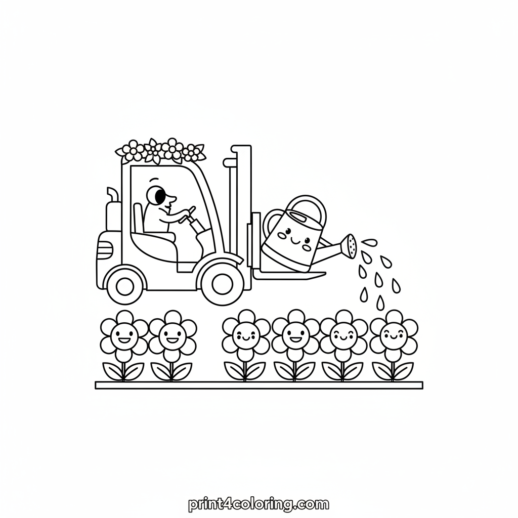Join our delightful forklift, sporting an adorable flower crown, as it becomes the ultimate garden helper! Watch as it carefully lifts a giant watering can, bringing a refreshing drink to a row of cheerful, smiling flowers. A whimsical scene of teamwork and nature's joy, perfect for little artists to brighten with vibrant colors.