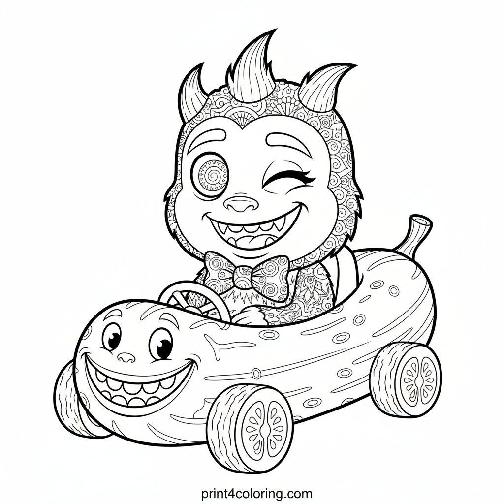 #monster#go-kart#pickle#silly#cartoon-vehicle#imagination#funny#character#coloring-page#printable