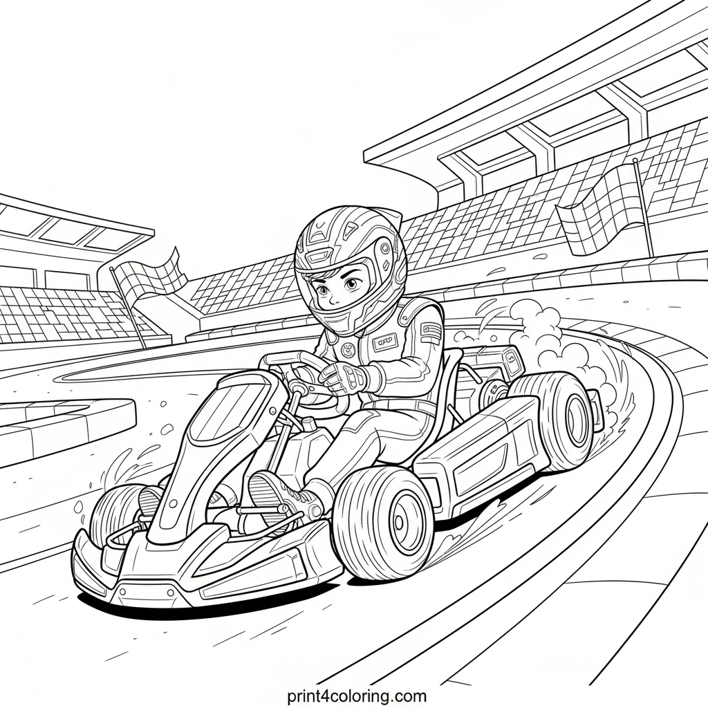 Get ready to zoom into action with this thrilling go-kart scene! A determined young driver, helmet on and suit ready, expertly navigates a curved track. Feel the speed with dynamic lines and dust trails, while grandstands and checkered flags cheer them on. A high-octane adventure awaits your colors!