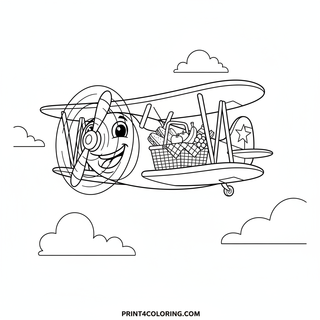 Join a cheerful biplane, its propeller painted with a happy face, as it gently soars through the sky! This friendly aircraft is on a special mission, carefully carrying a basket brimming with yummy picnic treats on its bottom wing. Imagine the delicious snacks it's delivering for a perfect sunny day. Get ready to add vibrant colors!