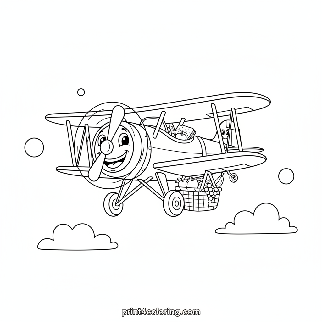 Soar into fun with this cheerful biplane! It's got a big smile painted on its propeller and is carefully carrying a basket brimming with delicious picnic treats on its bottom wing. Imagine all the yummy snacks it's delivering for a sunny day out. Get ready to add vibrant colors to the sky and this friendly plane's exciting journey!