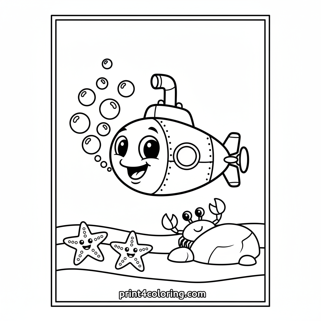 Dive into a bubbly adventure with our friendly submarine! This cheerful vessel has big, kind eyes and blows happy bubbles as it explores the vibrant ocean. It glides past smiling starfish and a curious crab. Get ready to add a splash of color to this joyful underwater scene!