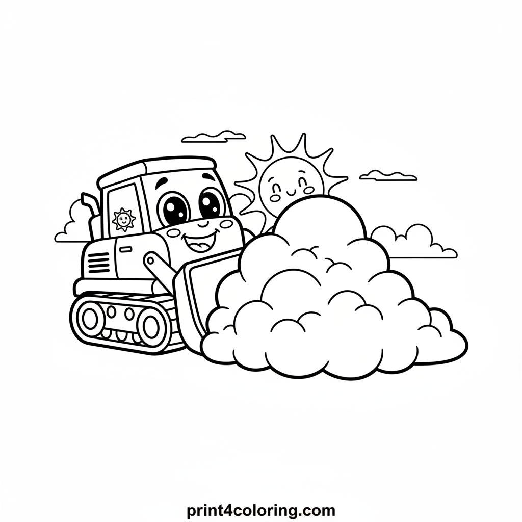 Our super cute, smiling bulldozer has big, friendly eyes and a wide smile! It's on a whimsical adventure, gently pushing a towering mountain of soft, fluffy clouds across a bright, sunny sky. This adorable scene blends the fun of construction with the magic of nature. Perfect for little artists to color and imagine!