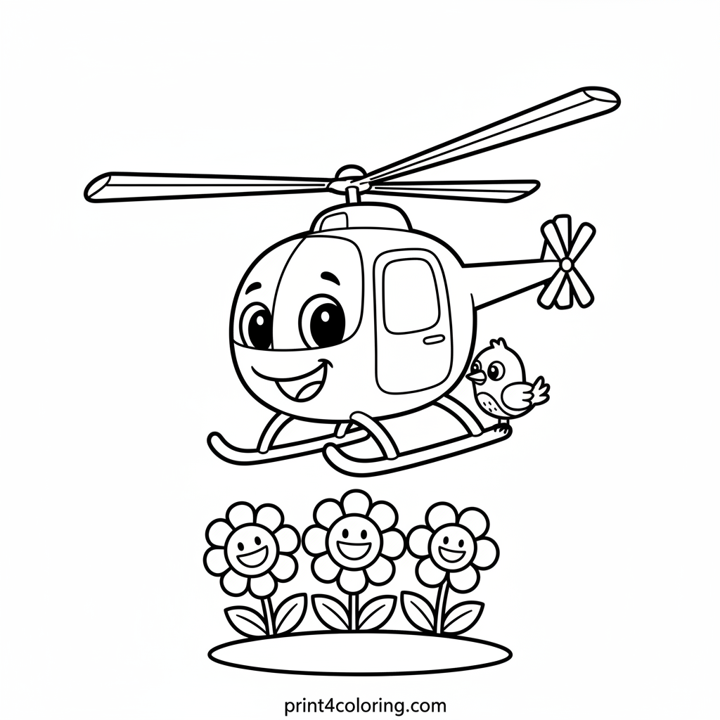 Join our adorable, smiling helicopter as it gently hovers above a vibrant field of happy, blooming flowers. With big, friendly eyes, this sky helper makes new friends! Can you spot the tiny bird resting peacefully on its landing skid? Get ready to add a burst of color to this cheerful scene!