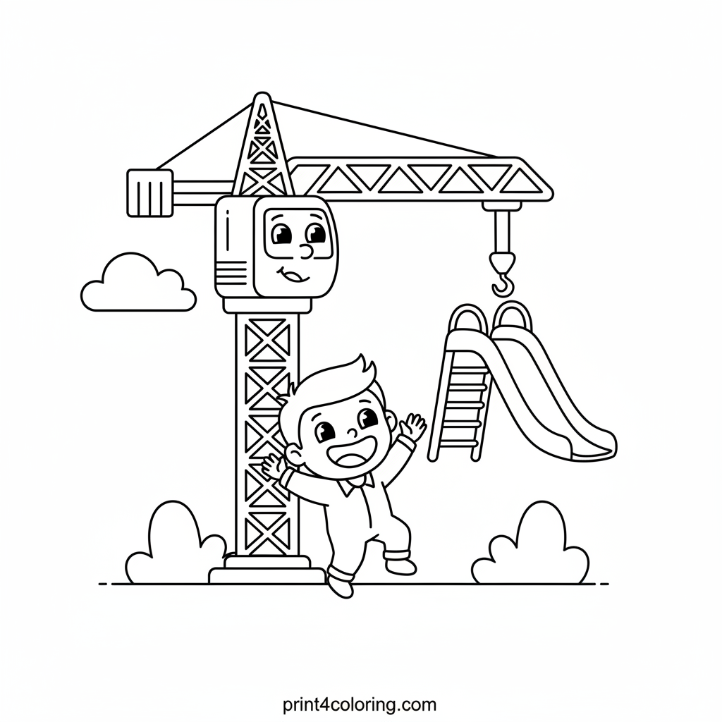Watch as a friendly giant crane carefully lowers a colorful slide into place, building a brand new playground! A happy child waves excitedly, eager for all the fun to begin. Imagine all the bright colors you can use to bring this busy construction scene to life, from the tall crane to the exciting new slide.