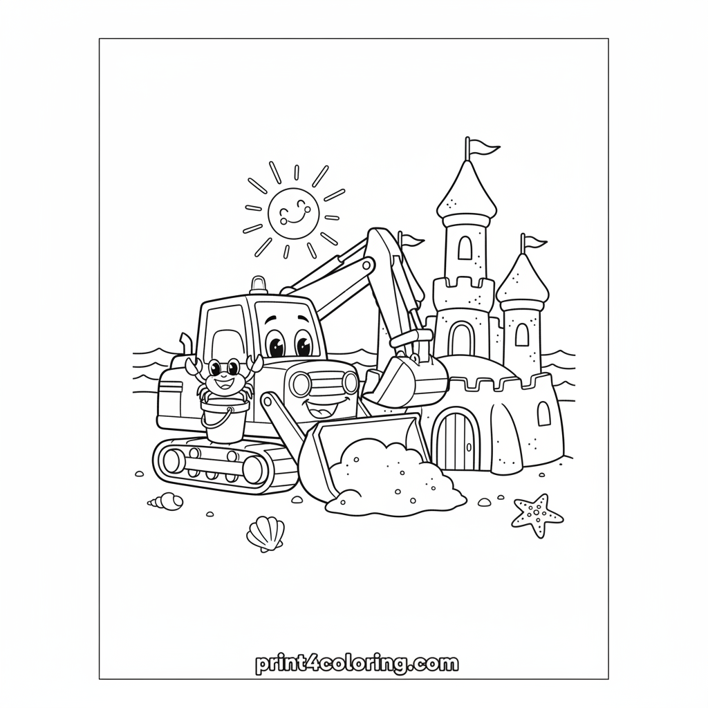 Join our happy, smiling excavator on a sunny beach adventure! Watch as this friendly machine gently scoops and piles sand to construct an amazing, multi-turreted sandcastle. A little crab even waves hello from the excavator's bucket, adding to the fun. Get ready to add vibrant colors to this delightful sandy scene!