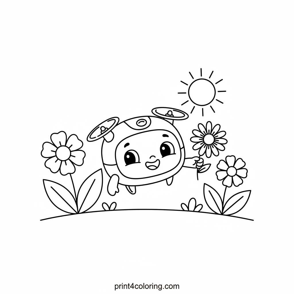 Imagine a tiny, happy drone with a big smile, carefully delivering a beautiful daisy! This friendly robot is soaring through a sunny garden, bringing joy with its special flower. Grab your crayons and add vibrant colors to this delightful scene, making the garden and drone come alive!