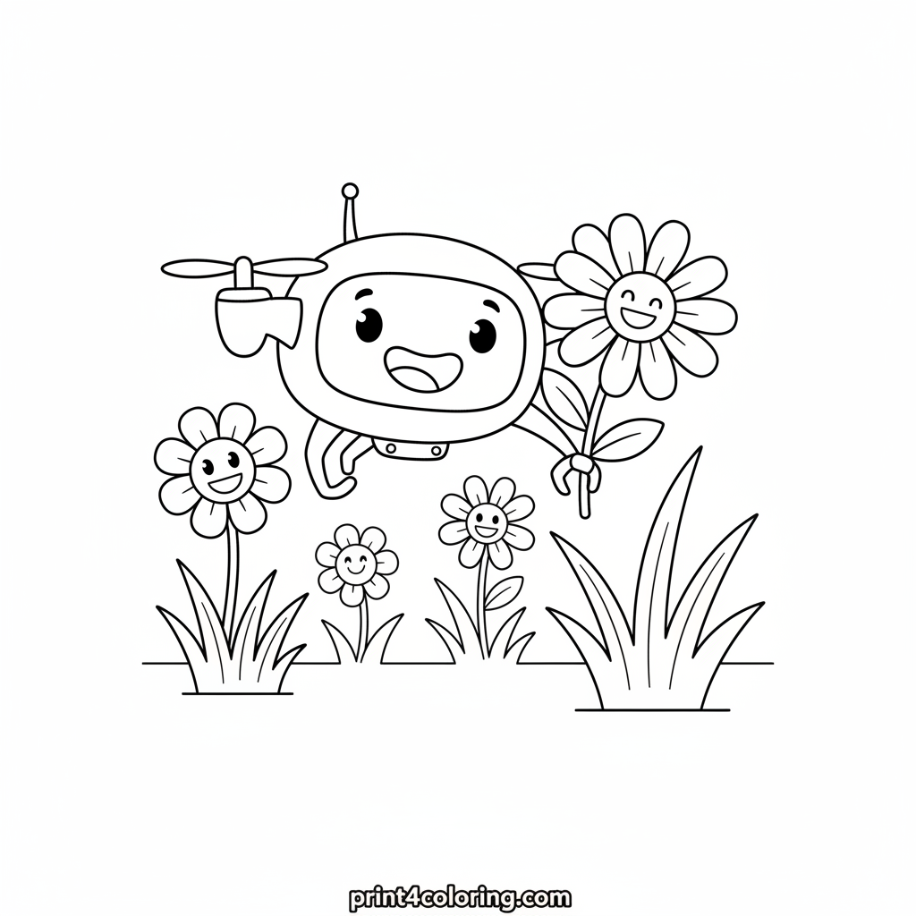 Imagine a world where helpful drones deliver happiness! This adorable, smiling drone is on a special mission, gently carrying a beautiful daisy through a bright, sunny garden. What colors will you choose for its happy journey and the lovely flowers it passes?