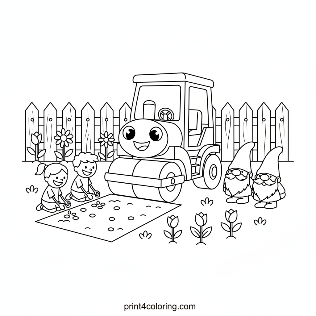 Dive into a vibrant community garden where a helpful steamroller is flattening ground for new plants. Happy children are busy planting seeds, while friendly garden gnomes watch over the fun. This delightful scene celebrates teamwork and nature, ready for your colorful imagination!