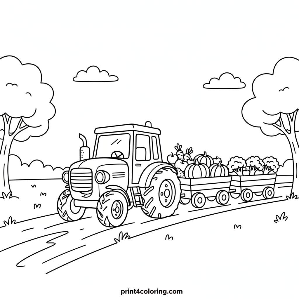 Get ready for a joyful farm adventure! This sturdy tractor is hard at work, chugging along a dusty path. Behind it, a cheerful train of three wagons overflows with a bounty of colorful fruits and vegetables, fresh from the garden. Imagine the vibrant colors you can use to bring this happy harvest scene to life!