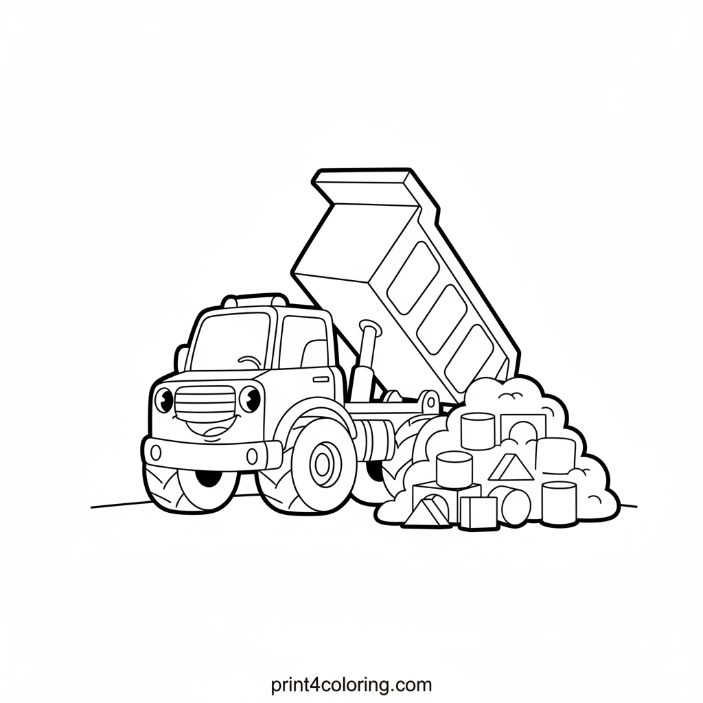 Get ready for a construction adventure! This coloring page features a sturdy, smiling dump truck, busy tilting its bed to unload a giant pile of soft, oversized building blocks. Imagine the colorful towers and castles you can build! A perfect scene for little builders to bring to life.