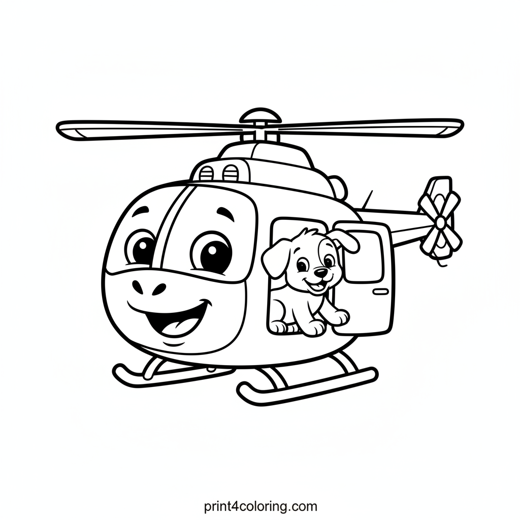 Meet Helico-Pal, the friendliest rescue helicopter around! With a big, happy smile and curious eyes, he's ready for adventure. Peeking out from his open door is a little, wagging puppy, excited to greet you. Bring this heartwarming scene to life with your favorite colors and imagine their next happy journey!