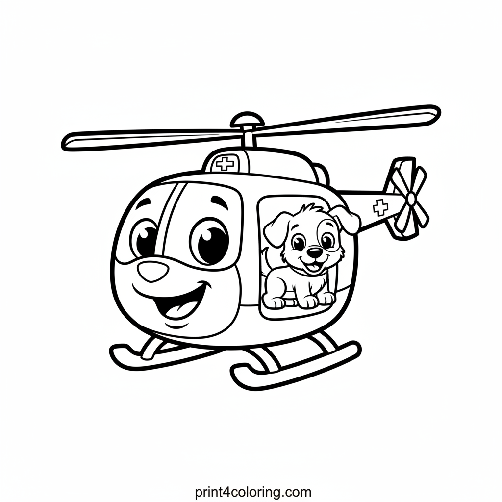 Get ready for a high-flying adventure with our friendly Helico-Pal! This cheerful rescue helicopter has a big, happy smile and curious eyes. Look closely, and you'll spot an adorable little puppy peeking out from the door, wagging its tail with joy. Imagine all the exciting places they could go together! Grab your crayons and bring this joyful scene to life.