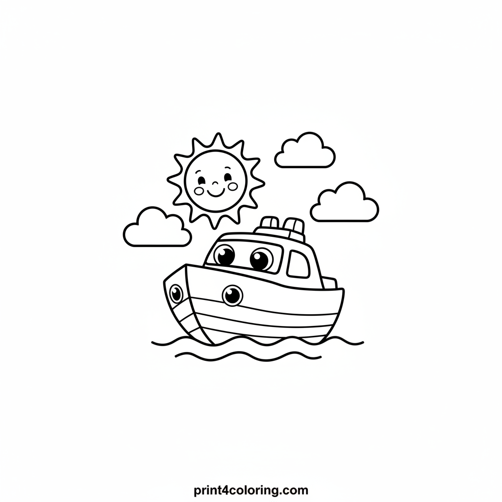 Set sail for fun with this happy little yacht! With big friendly eyes and a gentle smile, this adorable boat bobs happily on the simple, wavy ocean. The sun shines brightly above, making it a perfect day for a calm adventure. Grab your crayons and bring this delightful maritime scene to life!
