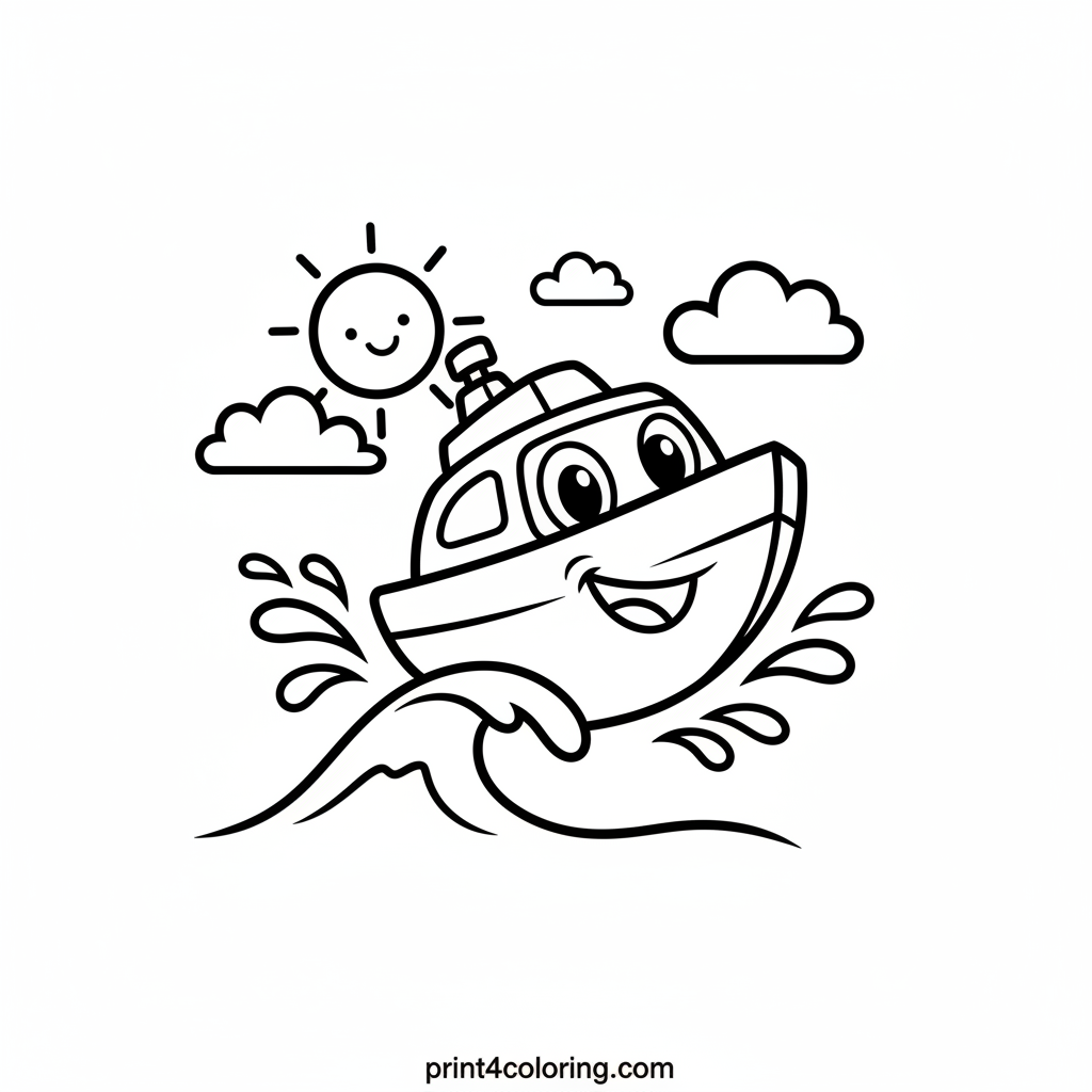 Set sail for fun with this happy little yacht! With big friendly eyes and a gentle smile, this round boat is cheerfully bobbing on simple, wavy water under a bright, sunny sky. Grab your crayons and bring this delightful scene to life. Imagine a perfect day on the water!