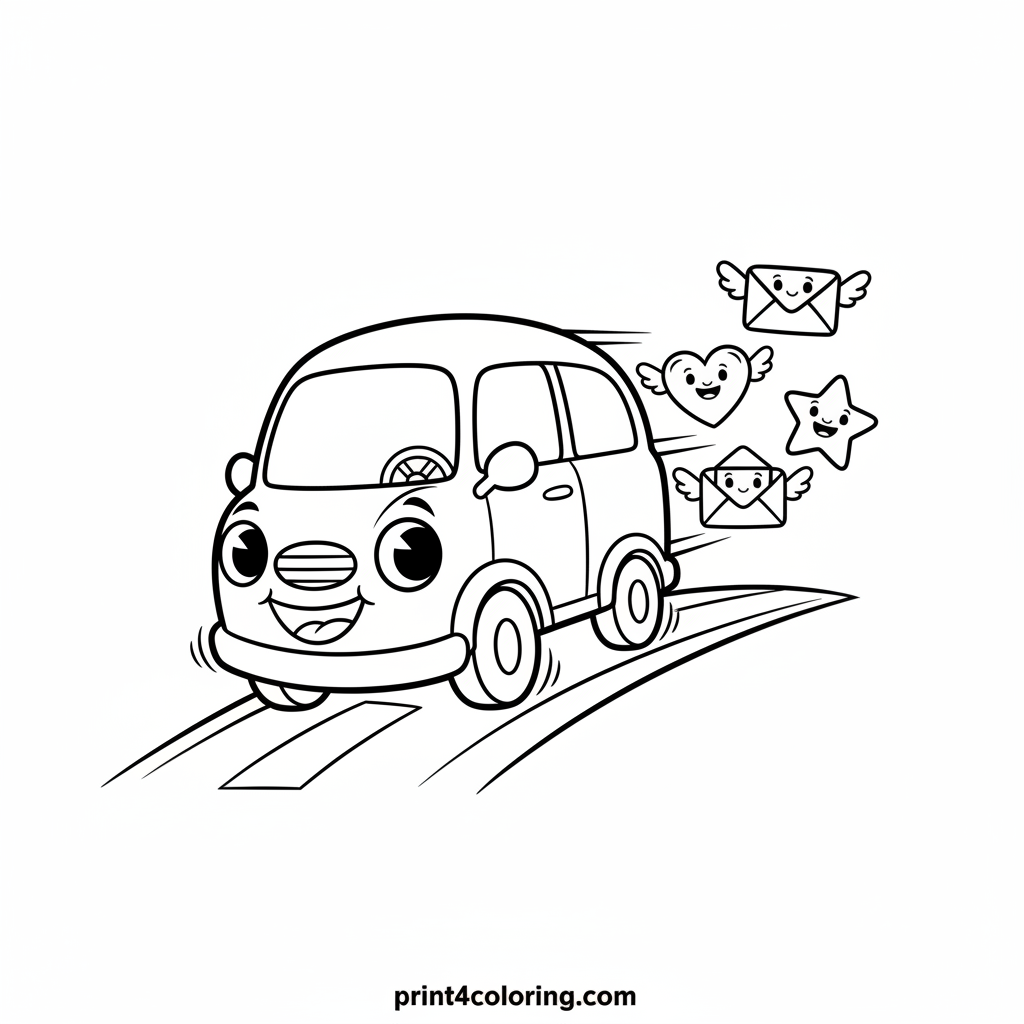 A cheerful mail van with a big smile is on a super speedy delivery! Watch it zoom along a winding road with a gentle hill, leaving a trail of friendly letters fluttering playfully behind. Grab your crayons and bring this exciting postal journey to life with vibrant colors!