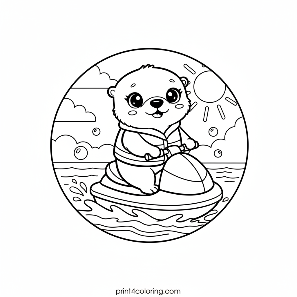 Join a super cute otter on its very first adventure! This happy little otter, with big joyful eyes, is wearing a tiny life vest and gently cruising across calm, wavy water on a brightly colored, rounded mini jet ski. Get ready to add vibrant colors to this cozy and adorable water scene!
