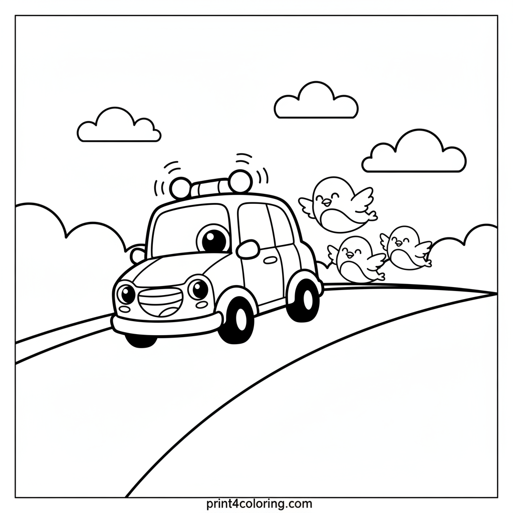 Join a cheerful police car with its siren lights softly twinkling as it embarks on a delightful chase! A flock of friendly, smiling birds flutters playfully ahead, leading the happy patrol car down a simple, winding road. This scene is full of fun and friendship, perfect for young artists to bring to life with bright colors. Imagine the happy sounds as they all enjoy this sunny adventure together!