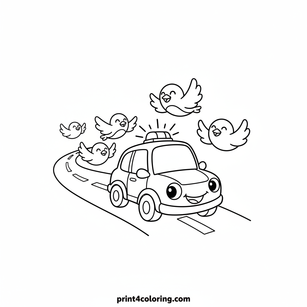 Join a happy police car with its siren lights gently flashing as it enjoys a playful chase! Watch it follow a flock of friendly, smiling birds down a winding, simple road. This delightful scene is full of fun and laughter, waiting for your vibrant colors to bring it to life!
